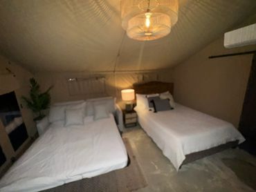 The Deluxe Queen Tent is a luxury glamping accommodation tailored for relaxation. It sits close to the fire pit and its interior design result is all the comforts of modern living without the stress. Our efficient layout means we maximised the space for you and yours. The Deluxe Queen Tent has its own lavish bathrooms with upscale features. High-end, lush linens and towels. Deluxe pillows and mattresses so your sleeping hours are as blissful as your waking ones. We strive to create the perfect balance of tropical beauty and comfort. We want our guests to experience luxurious surroundings that also beckon them to cozy up and stay a while.